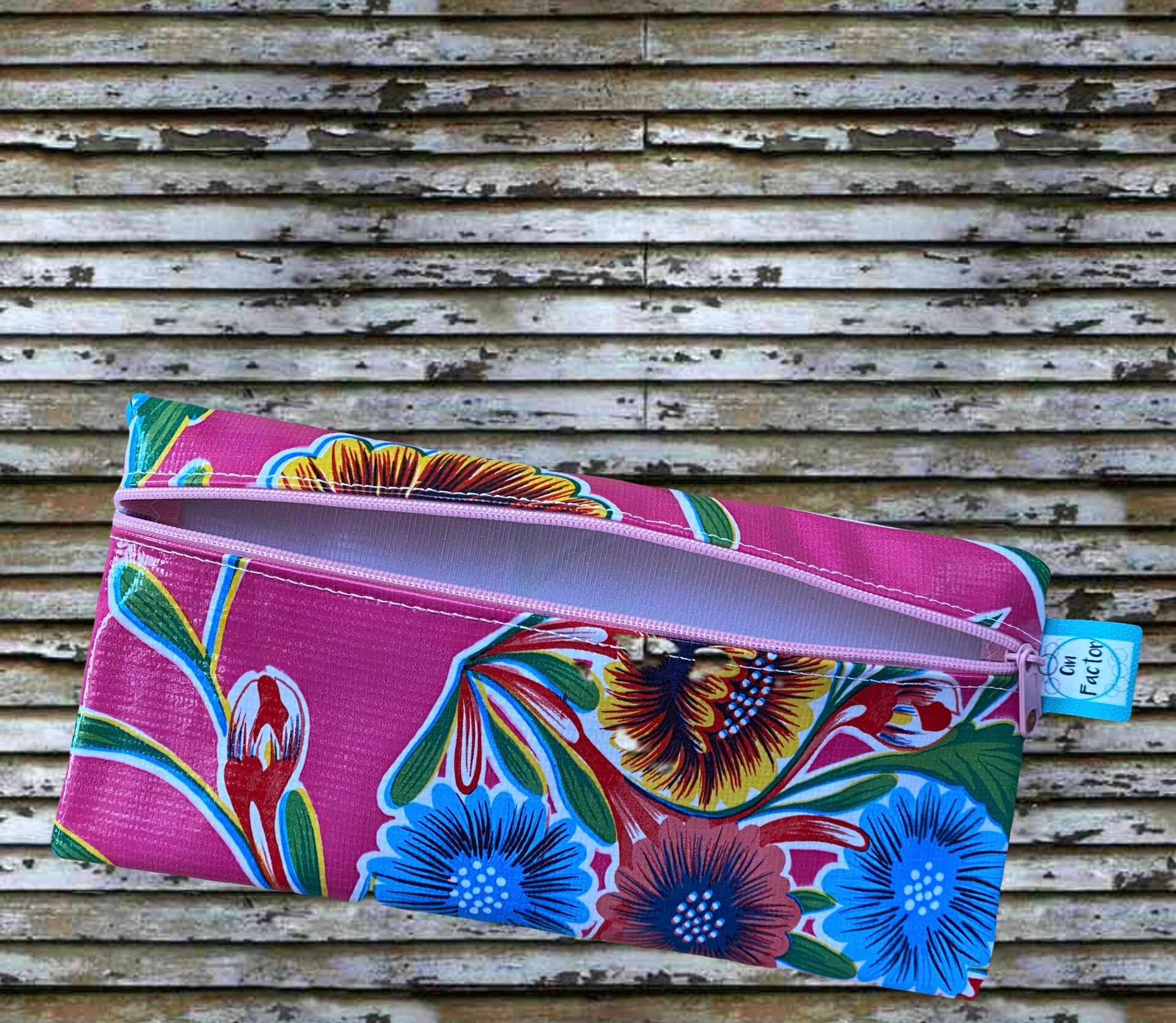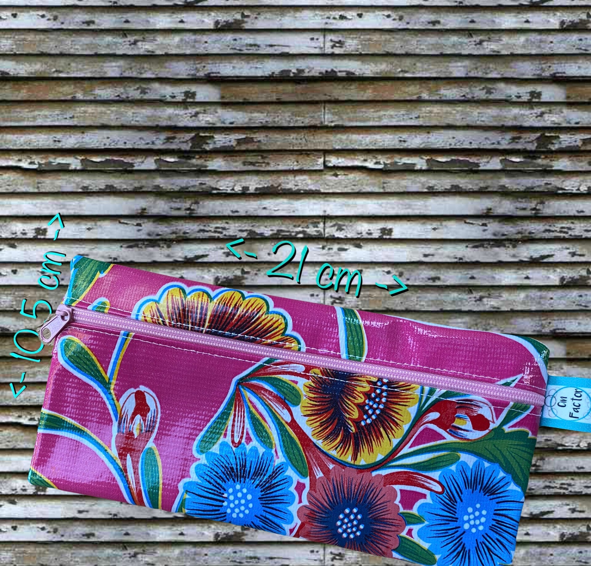 Dit vrolijke tasje van ongeveer 10,5 x 21cm en gemaakt van tafelzeil kan als toilettasje worden gebruikt, maar is ook super leuk als etui.